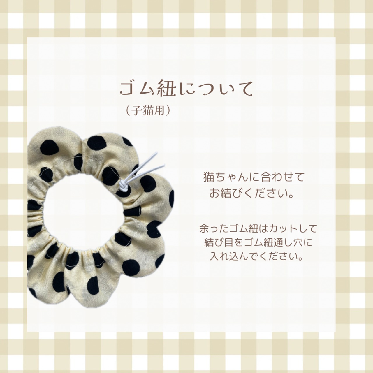 ゴム紐は猫ちゃんに合わせてご自身で結んでいただくようになります。